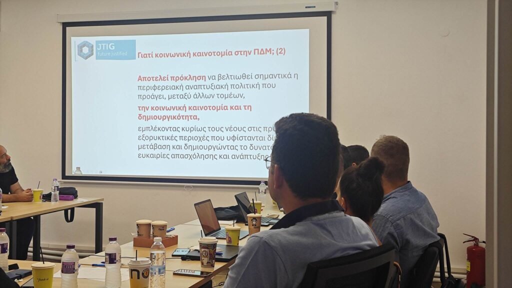 Όπως εξήγησε ο κ. Καραμάρκος, η κοινωνική καινοτομία μπορεί να φέρει μια συμπληρωματική – εναλλακτική προσέγγιση στην αντιμετώπιση κάποιων προβλημάτων των περιοχών μετάβασης για την επίλυση κοινωνικών, δημογραφικών, εργασιακών, πολιτιστικών και περιβαλλοντικών προκλήσεων, & την κινητοποίηση φορέων της κοινωνίας των πολιτών και την προώθηση της οικονομικής, κοινωνικής και περιβαλλοντικά βιώσιμης ανάπτυξης.